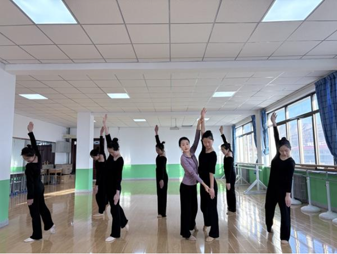 会宁职业中等专业学校梦芽舞蹈社团里,牟文文老师在指导学生的舞蹈动作。受访者供图