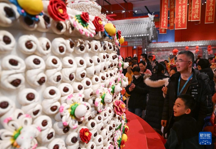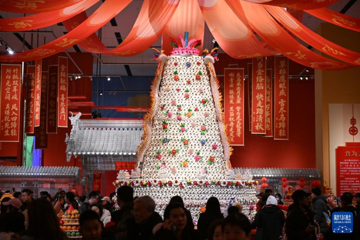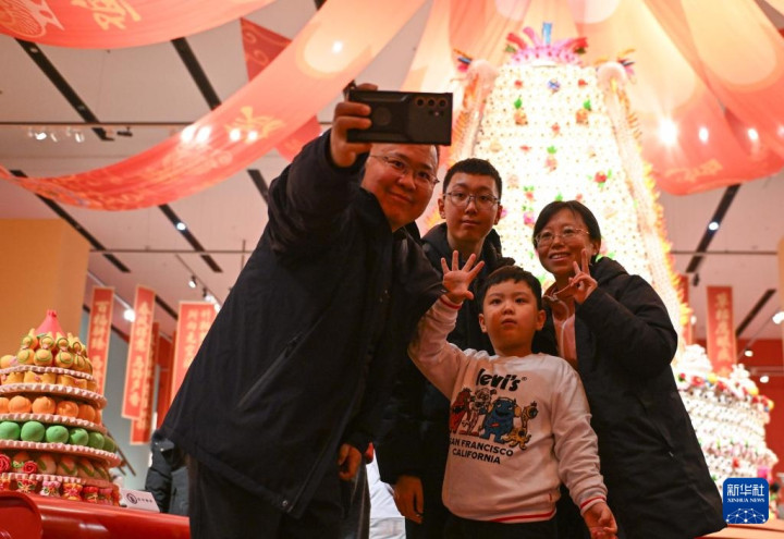 2月15日,观众在“过年——丙午春节系列主题展”上观看陕西非遗代表性项目澄城面花作品“大鼓枣山”。新华社记者陈钟昊摄