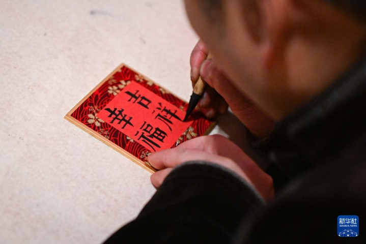 2月15日,在“过年——丙午春节系列主题展”上,工作人员为观众书写祝福语。新华社记者陈钟昊摄